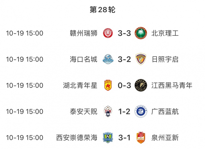 2024赛季中乙第28轮,共有5场比赛在10月19日进行。