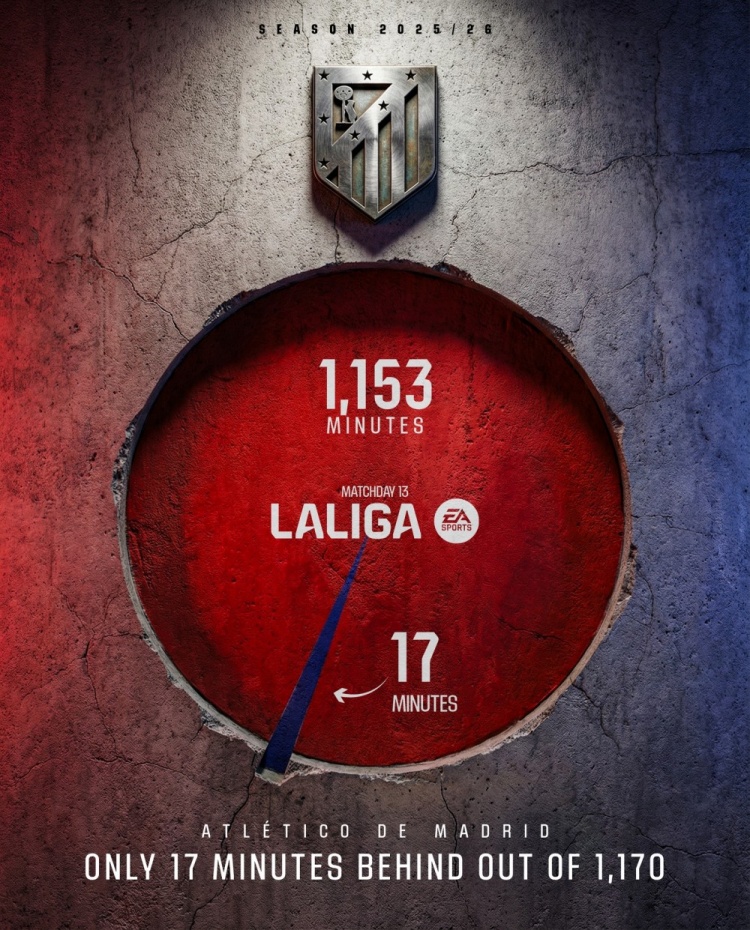 据西甲官方统计,在本赛季于今1170分钟的西甲比赛技能里,马竞仅落伍过17分钟,是本赛季西甲落伍技能最短的球队。