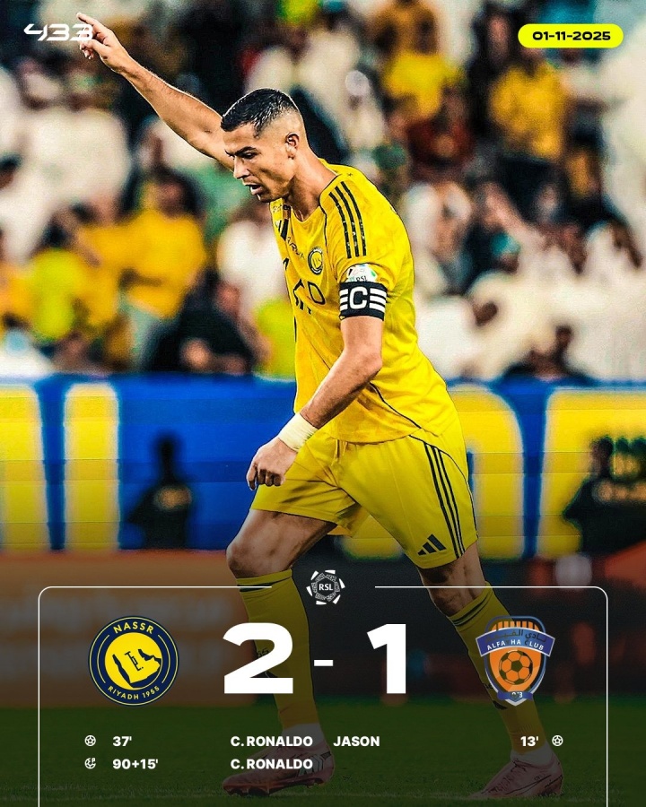 11月1日晚上的沙特联第7轮,利雅得班师主场2-1逆转费哈,C罗双响+第104分钟点射绝杀。
