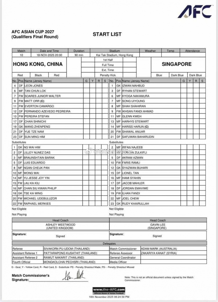 亚初赛出线要道战!中国香港vs新加坡首发:安永佳、陈晋一领衔