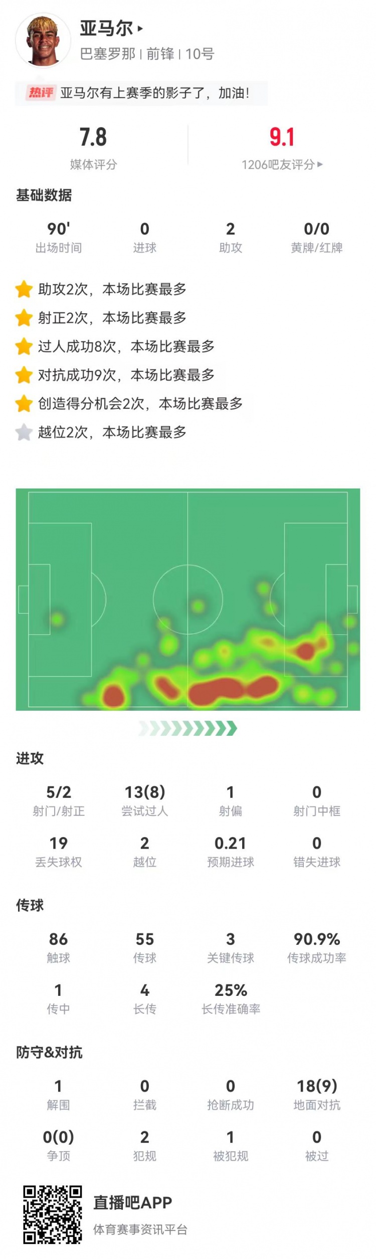 亚马尔本场2助攻+3要道传球 5射2正+13过东谈主8得手 获评7.8分