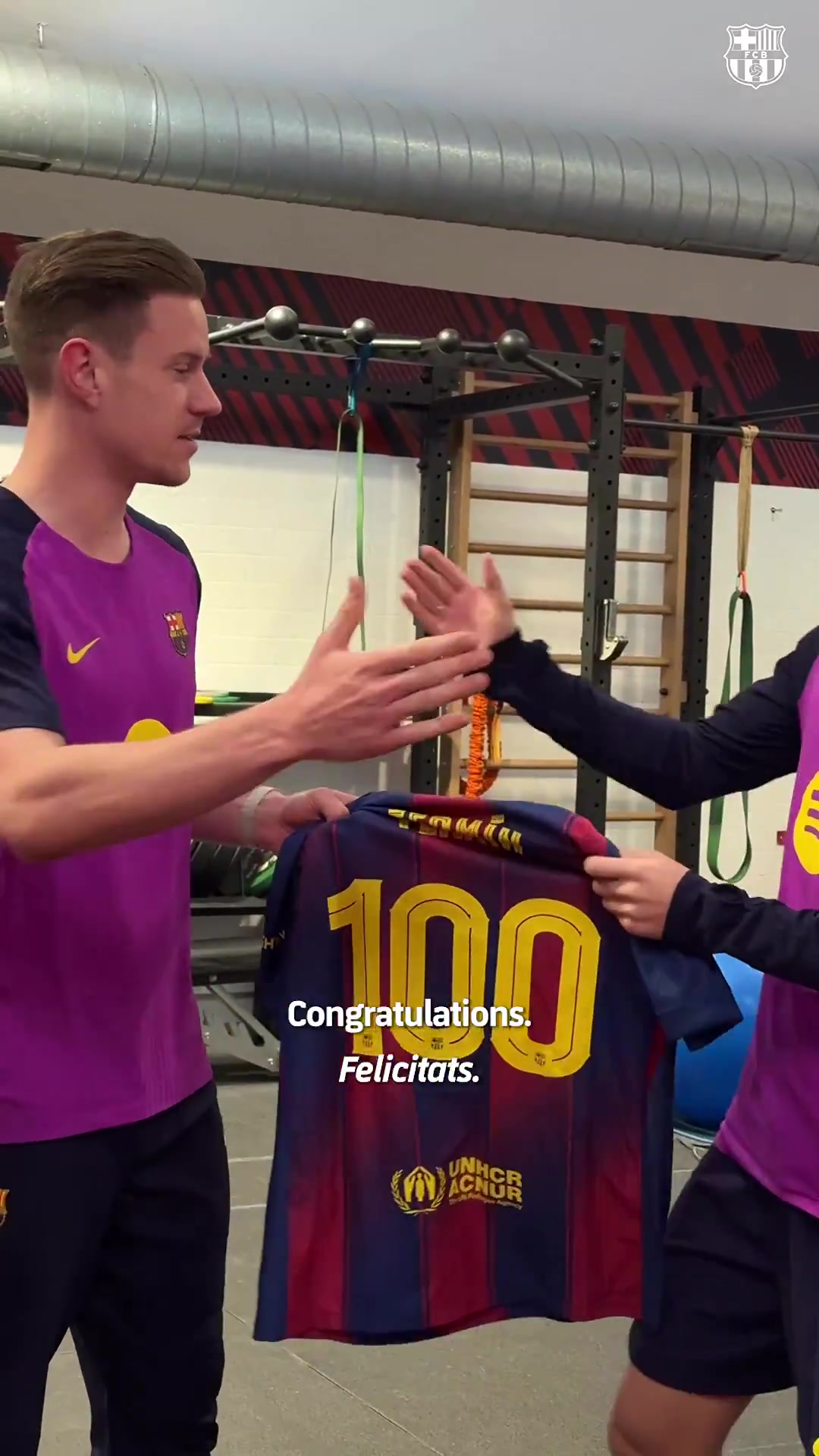 11月27日讯 巴萨官推晒视频,费尔明取得了俱乐部百场里程碑球衣,并在队友的蜂涌下展示了球衣。