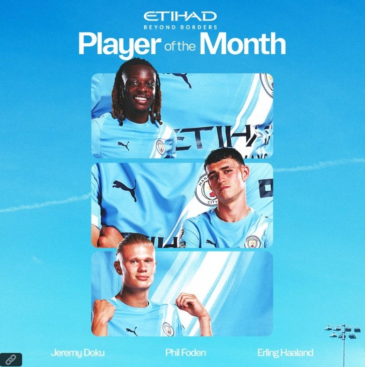 曼城官方9月队内最好球员候选:哈兰德领衔,多库、福登在列