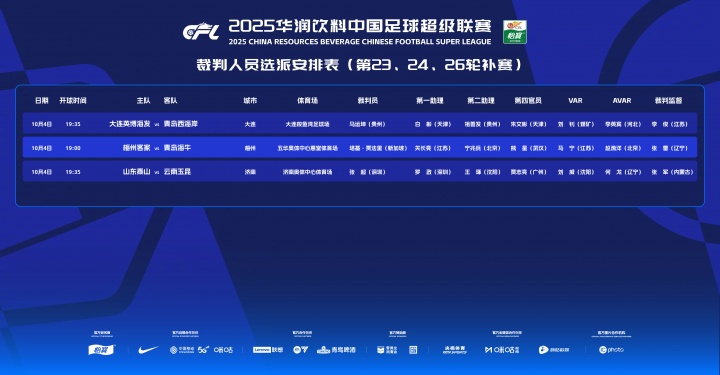 青岛西海岸vs大连英博本场比赛主裁判为马运坤,VAR裁判刘钊。
