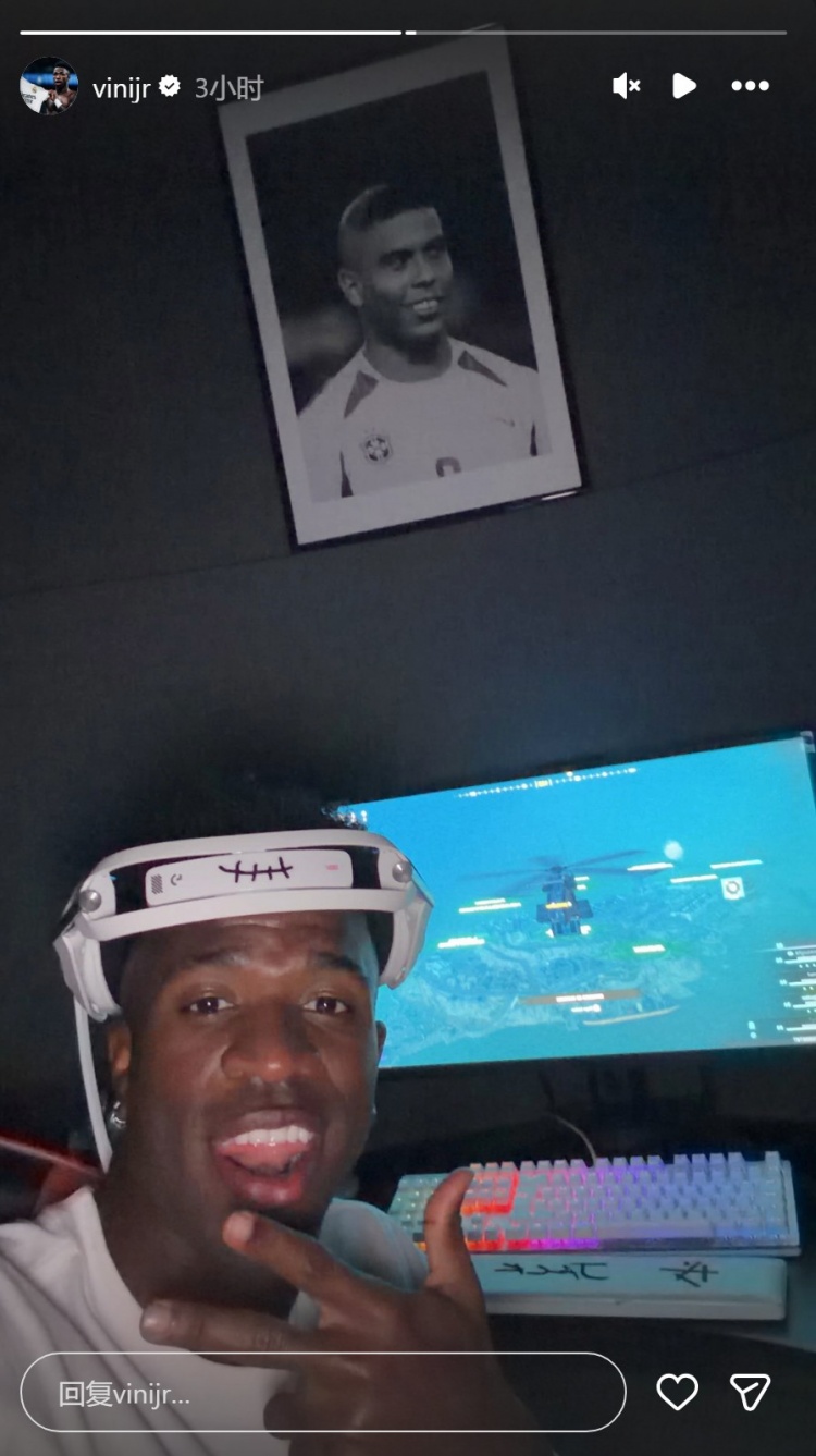 维尼修斯适意时间玩游戏,他在酬酢媒体上晒出相片,巴西神话球星罗纳尔多的海报出镜。