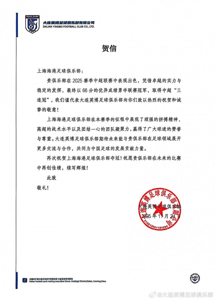 贵俱乐部在2025赛季中超联赛中阐发出色,凭借超卓的实力与肃穆的说明,最终以66分的优异收成勇夺联赛冠军,得到中超“三连冠”,咱们谨代表大连英博足球俱乐部向你们致以激烈的祝愿和针织的敬意!