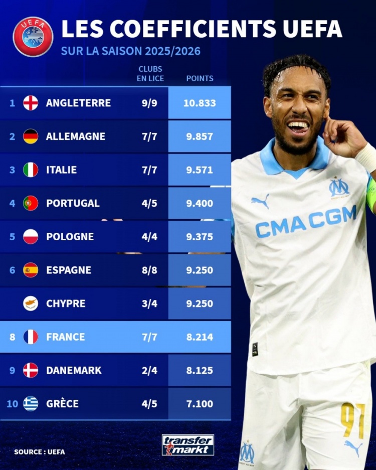 11月29日讯 德国转会阛阓列出了本赛季欧战积分名次,英超、德甲前两位,意甲升至第三位。