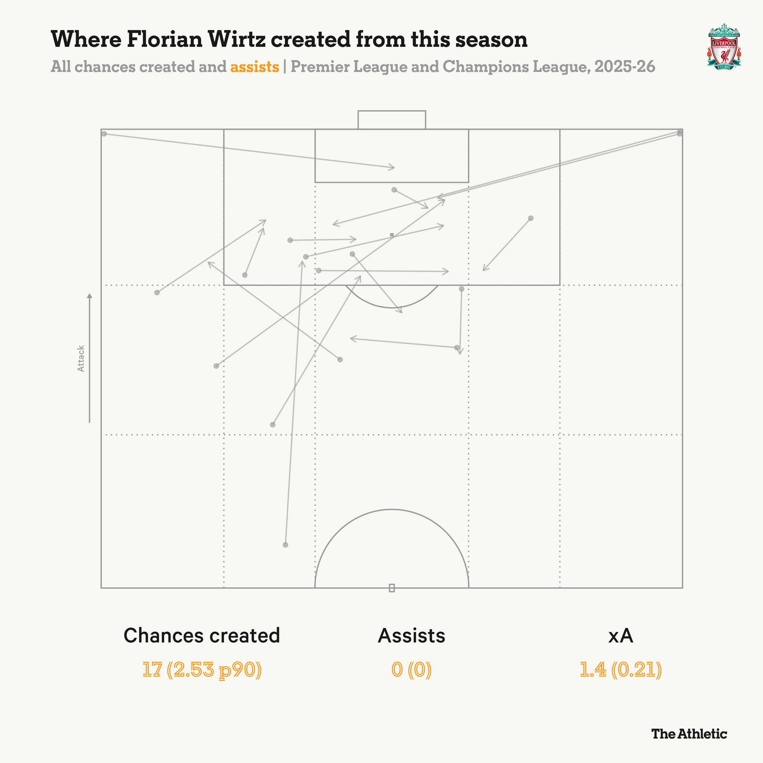 本赛季整个比赛中,包括在温布利球场进行的足总杯冠军对阵足总杯冠军的决赛,维尔茨创造了21次契机。在英超球员中,唯有埃弗顿租赁自曼城的球员杰克-格拉利什能与他匹敌。