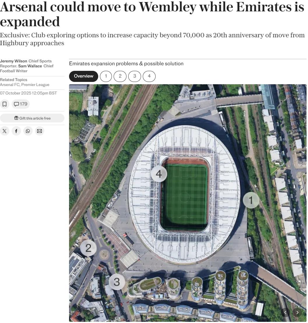 电讯报记者JW和SW衔尾发文闪现,阿森纳正盘算大限制扩建酋长球场,而这可能会导致他们暂时将主场比赛迁至温布利球场,从目下的探讨细节来看,本次扩建可能将酋长球场60700东谈主的容量实验至70000东谈主以上。