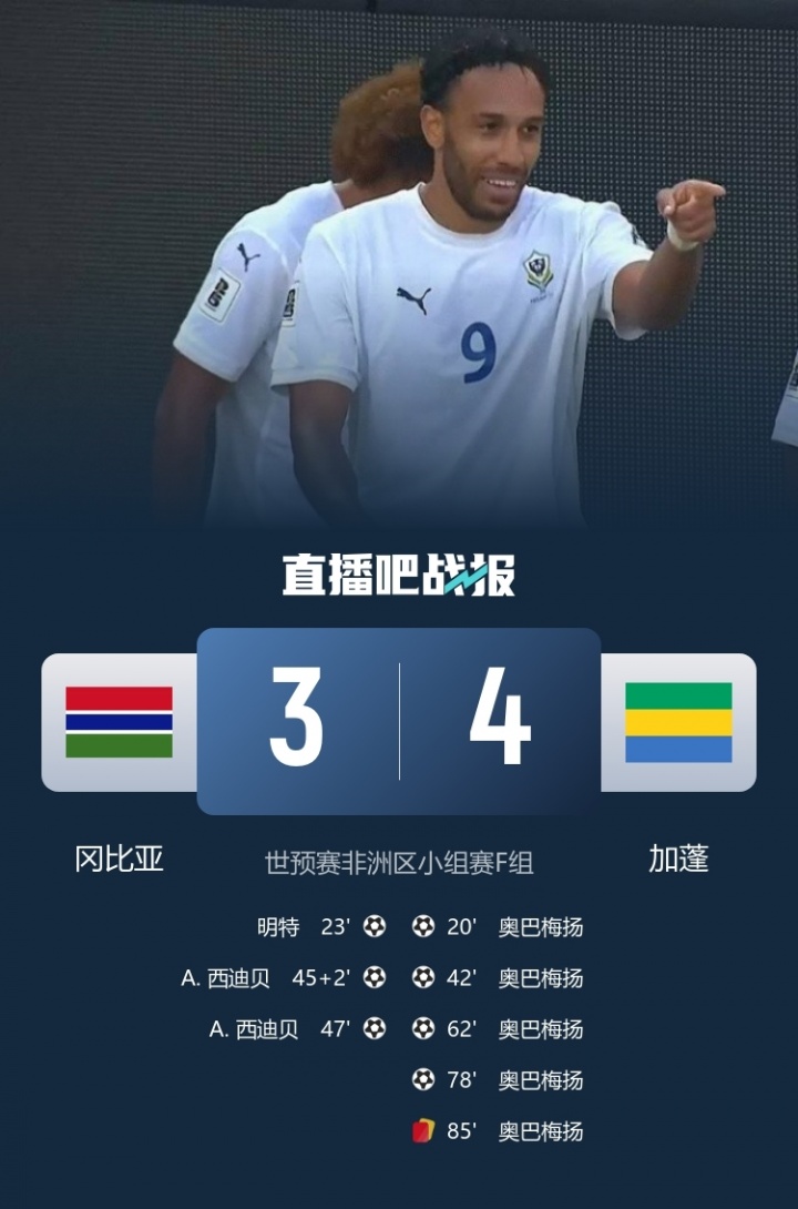 10月10日讯 世初赛非洲区F组第9轮比赛,加蓬客场4-3降服冈比亚,36岁的加蓬先锋奥巴梅扬演出大四喜,一己之力为加蓬拿下了这场告成!
