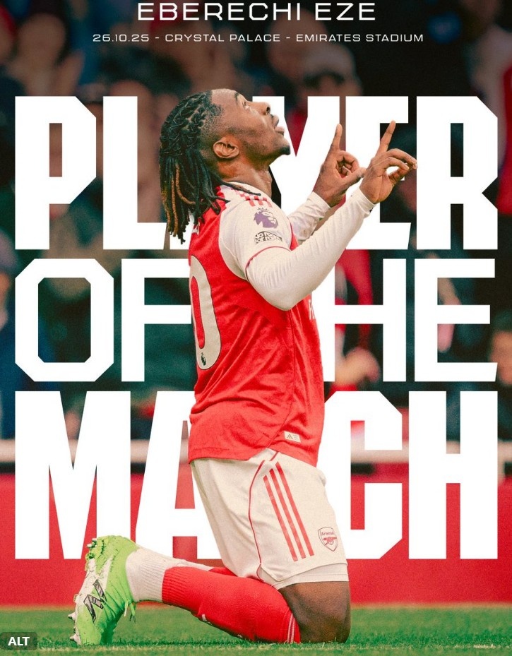 濒临旧主打进制胜球,官方:埃泽当选阿森纳1-0水晶宫队内最好