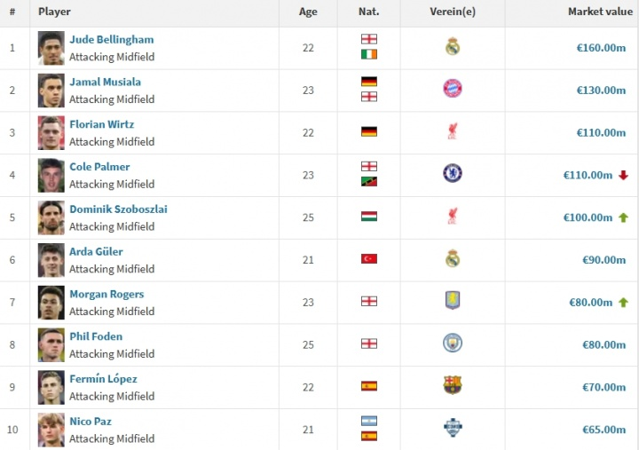 攻击战术型中场领导能力强身价榜: 贝林1.6亿居首, 索博1亿超居莱尔升第五