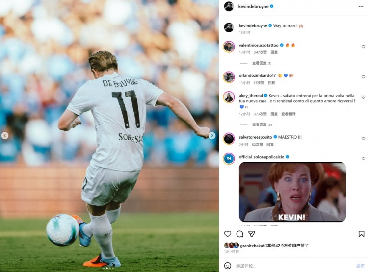 意甲首战破门,德布劳内社媒晒破门短暂:以可以的样式开启新赛季