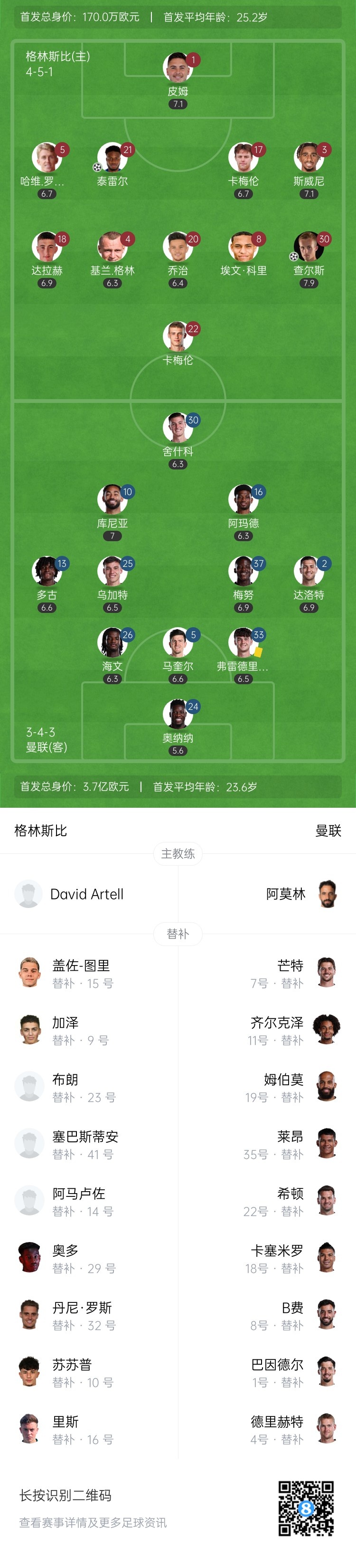 第30分钟,格林斯比左侧角球契机,传中到禁区中,奥纳纳出击空虚,沃伦将球打进佛门!曼联0-2落伍格林斯比↓