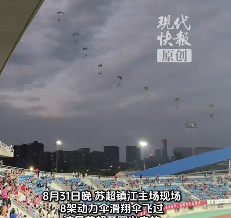 8月31日讯 据《当代快报》报谈,今晚苏超镇江主场现场,8架能源伞飞过,这是苏超开赛以来的初次能源伞摇荡饰演 ,亦然镇江体旅会通的新花式。
