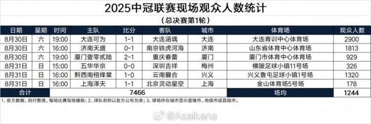 2025中冠联赛现场不雅世东说念主数统计(总决赛第1轮)
