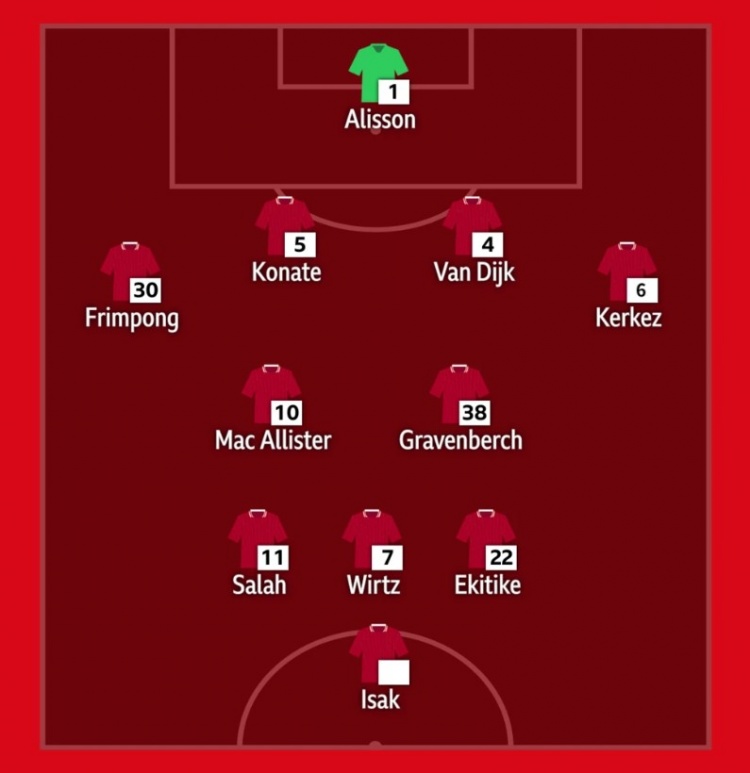 该体系下,萨拉赫、维尔茨和埃基蒂克将依次担任10号位。当萨拉赫或埃基蒂克拉边,另一东谈主会蚁集维尔茨,与麦卡利斯特、赫拉芬贝赫造成菱形中场。在某些情况下,埃基蒂克或萨拉赫也可径直顶上去,以中锋身份接济伊萨克要紧。